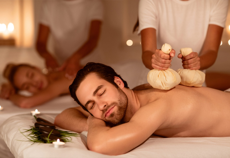 Warm herbal pouches filled with natural Thai herbs are applied to the body, helping detoxify skin, relieve muscle pain, and stimulate circulation.